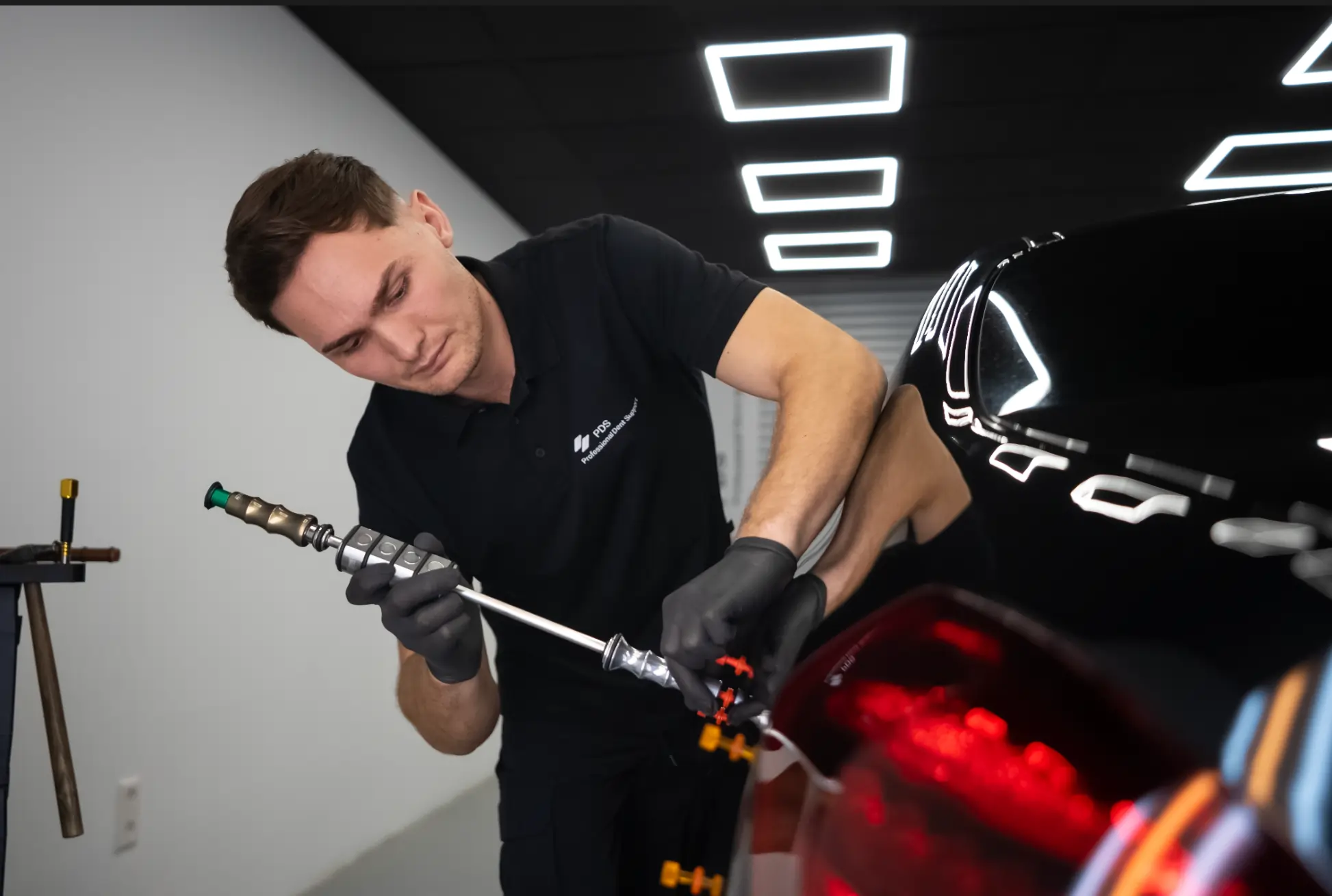 Bei der lackschadenfreien Ausbeultechnik (Paintless Dent Repair, kurz PDR) werden Hageldellen gezielt von innen oder außen zurückgeformt – ganz ohne Spachteln oder Lackieren. Dadurch bleibt der Originallack vollständig erhalten. Die Methode ist nicht nur besonders materialschonend, sondern auch schneller und günstiger als herkömmliche Reparaturen.